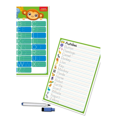 Набір містить двосторонню дошку та багаторазовий маркер. З однієї сторони зображено англійську абетку, а з іншої – слова на кожну букву. Дитина може спочатку обвести букви та слова по контурах, а потім написати їх в рядок самостійно.