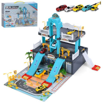 Гараж A246 (9шт) 65-63-в43см, 2 поверхи, ліфт(механічний), машинка 7см 4шт, вертоліт, дорожні знаки, дерева, 83дет, складається в чемодан (пластик+кар :