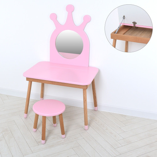 Комплект складається з столика трюмо та табурета, які чудово підійдуть щоб створити затишну та казкову обстановку для Вашої маленької принцеси.