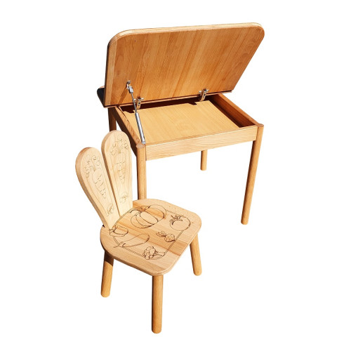 В набір меблів входить столик з місцем для зберігання та оригінальний стілець з високою спинкою у формі вушок зайчика. Меблі виготовлені з букової деревини та покриті лляною олією з бджолинним воском, які є повністю безпечними і екологічно чистими матеріалами.