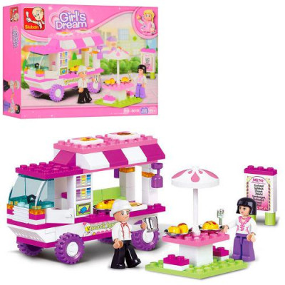 Конструктор SLUBAN M38-B0155 (72шт) кафе на колесах, фігурки, 102 дет,в кор-ці, 19-14-4,5 см : Конструктор Qman 1803 (128шт) військова техніка, від38дет, 8шт(8видів) в дисплеї, 26,5-9-19,5см