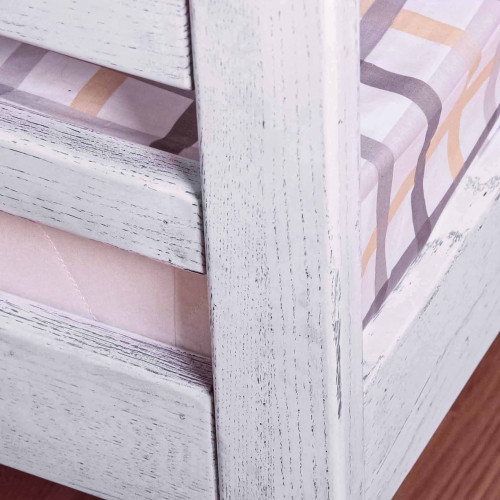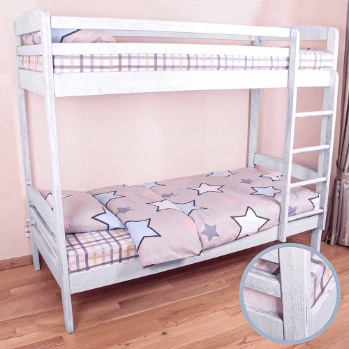Ліжко виготовлене з натурального дубового дерева, покритого білою фарбою та чорною патиною, що відмінно підкреслює текстуру дерева. Основа днищ - гнутоклеєні букові ламелі, які надійно втримають матраци у рівному горизонтальному положенні. Задля безпеки спальні місця обладнані високими бортиками. Піднятись до верхнього ліжка можна спеціальною драбинкою, яка міцно прикріплена збоку.