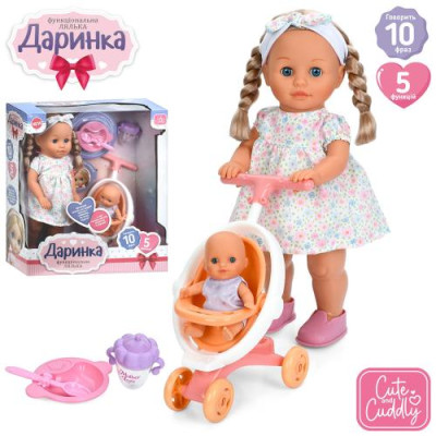 Лялька M 6194 I UA (8шт) Даринка, 40см, музика-звук(укр), пісня, ходить, 2 режими, пупс 13см, коляска 17-27-14см, посуд, пляшечка, на бат-ці, в кор-ці