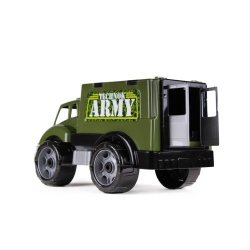 Іграшка «Автомобіль ТехноК» -транспорт спеціального призначення, захисного кольору «хакі». Завдяки великим колесам та міцній рамі машина демонструє високу прохідність на дорогах та на бездоріжжі. Задні двері автомобіля відкриваються.