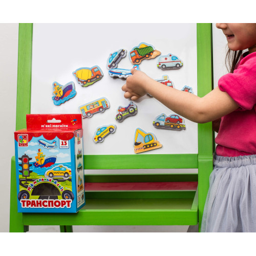 Набір м’яких магнітів познайомить Вашого малюка з різними машинками. Вивчайте їхні назви, дізнавайтеся, для чого вони існують, які функції виконують та хто ними керує. Запам’ятовуйте їхні особливості.