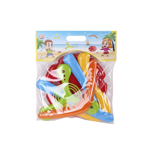 В комплекті два літаючих диска і три бумеранги. Літаючі диски з поліпшеними аеродинамічними властивостями можна застосовувати в класичних фрісбі-іграх: "Фрістайл", "Дог-фрісбі", "Диск-гольф", а бумеранги дадуть можливість відчути себе справжнім мисливцем.