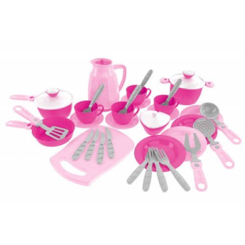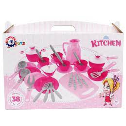 У кухонному наборі все по-справжньому, як у дорослої мами. В розпорядженні маленької господині 38 елементів (в т.ч. кавник та дощечка для нарізки) виконаних у оригінальній кольоровій гаммі модельної лінійки Кухонних наборів ТехноК.