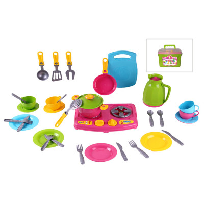 Дитячий кухонний набір, який тепер може бути разом зі своєю маленькою господинею завжди і всюди . Іграшковий посуд упакований в зручну яскраву пластикову валізку з ручкою та напівпрозорою кришкою.