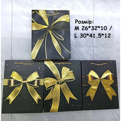 Пакет подарунковий середній "Золотий бант на чорном" M 26x32x10 см 15724 :