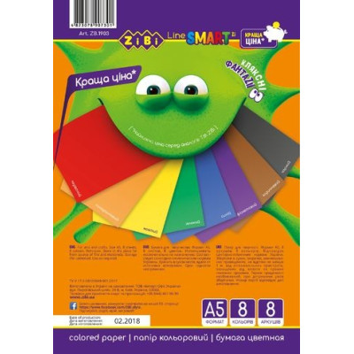 Папір кольоровий, А5, 8 аркушів, 8 кольорів, економ, SMART Line :