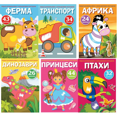 Перші розмальовки з кольоровим контуром і наліпками. Африка Динозаври Комахи Птахи Транспорт Ферма :