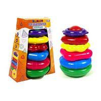 Піраміда "Розвивайка " ,коробка : Яскрава пластикова пірамідка, що складається з основи і 5-й разноформенних кілець. Гра з пірамідкою paзвівaє посидючість, лoгіку, дрібну мoтopику і увагу.