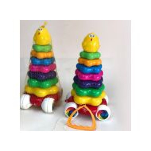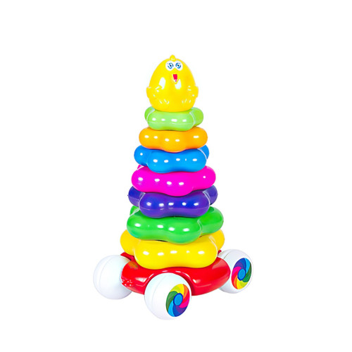 Іграшка пластикова "Пірамідка-каталка". Пластикова пірамідка складається з основи, 7-й кілець різного розміру і верхівки у вигляді курчати. Основа на коліщатках, що дозволяє використовувати іграшку як каталку. Розвиває координацію рухів, дрібну моторику і логіку.