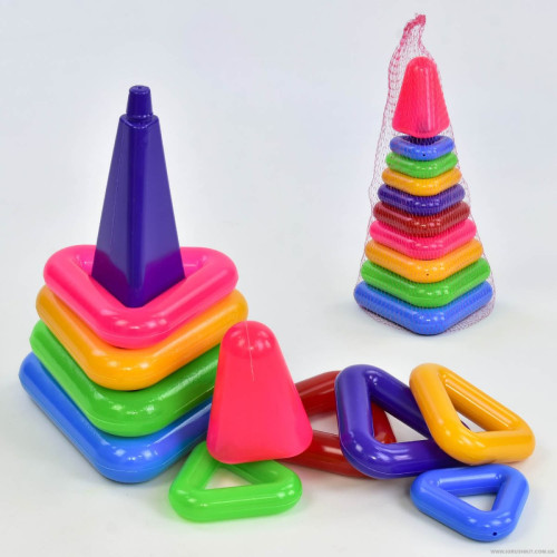 Логічна іграшка "Пірамідка трикутна. Пірамідка складається з трикутного підстави, 8-ми кілець трикутної форми, і вершини у вигляді округленій конуса. Пірамідка розвиває дрібну моторику, координацію рухів, пам'ять і увагу.