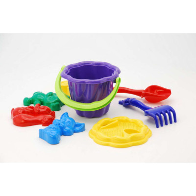 Пісочний набір "Ромашка" №1. У набір входить: відро з ситом, граблі, лопатка і 3 пасочки. Підходить для гри вдома, на вулиці, в саду і на пляжі. Розмір лопатки і грабельок - 21 см, розмір пасочки - 10 - 12 см, відро -16 х 16 х 12,5 см.