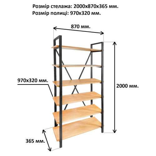 Такий стелаж чудово підходить як для житлових приміщень поціновувачів мінімалізму, так і для офісів чи робочих зон. Конструкція передбачає розміщення до шести полиць, що цілком задовольнить базові потреби для зберігання книг, предметів декору, інструментів чи робочих матеріалів.