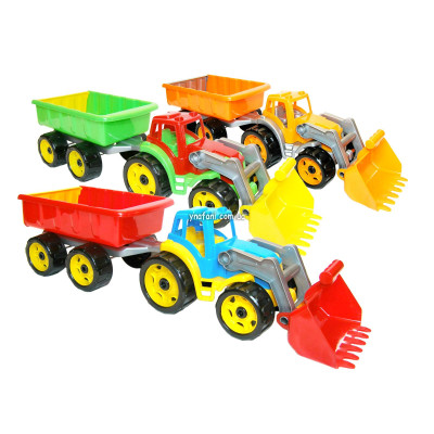 Яскравий пластиковий трактор з ковшом спереду і причепом ззаду. Ківш на тракторі опускається і підіймається дуже легко і має декілька фіксованих положень. Цим ковшем дуже зручно завантажуватиме вантаж в причіп. Також трактор має великі і міцні всюдихідні колеса.
