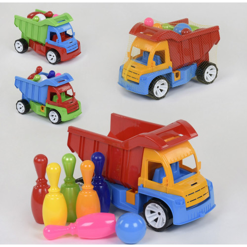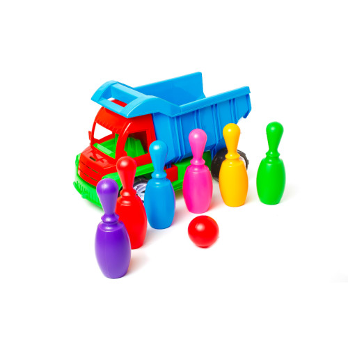 Вантажівка-самоскид з 6-ма кеглями та кулею - це універсальна іграшка для пісочниці, адже це велика і красива, кольорова і яскрава машина з місткою кабіною і функціональними колесами.