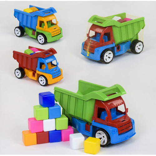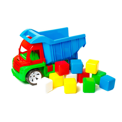 Вантажівка-самоскид з кубиками - це універсальна іграшка для пісочниці, адже це велика і красива, кольорова і яскрава машина з місткою кабіною і функціональними колесами. Але, головне в цій дитячій машинці те, що вона має глибокий відкидний кузов.